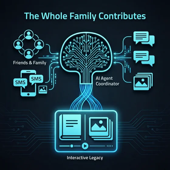 Your story isn't just yours. Friends and family are invited to add their own memories and photos via text — the fishing trip you forgot about, the birthday you didn't photograph, the side of you only your college roommate knew. A dedicated AI agent coordinates group contributions for milestones and occasions, weaving multiple voices into a richer, fuller legacy.