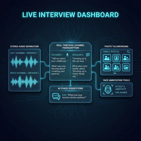 When interviews happen in person, the operator gets a full production cockpit — a custom-built React interface with stereo audio separation, real-time transcription on both channels, an AI coach suggesting follow-up questions, photo tile browsing, and face annotation tools. Everything the interviewer needs to capture a life story, in one screen, with nothing to configure.