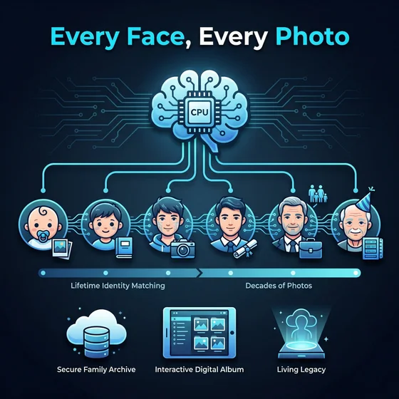 Send in a shoebox of unlabeled photos and the system identifies who's in every one — matching faces across decades, from baby pictures to retirement parties. As you tell stories, names get linked to faces automatically. What was once a pile of forgotten prints becomes a fully cataloged family archive.