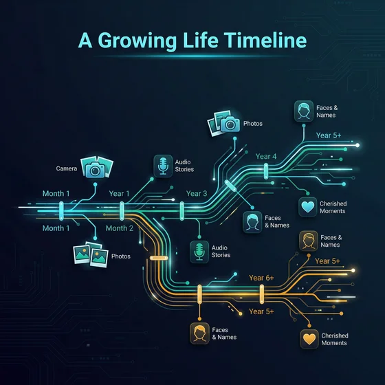 Every interview, every photo, every contribution gets placed on a persistent timeline that grows over months and years. The system builds a structured, searchable record of your life — photos linked to stories, faces linked to names, moments linked to the people who were there. The foundation for a browsable legacy that future generations can explore in your own words.