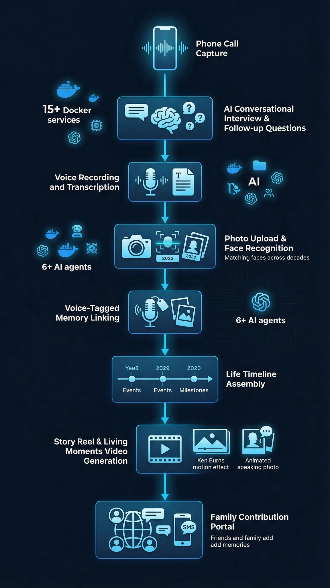 Every person who dies takes a library with them. The jokes only they told. The family recipes that were never written down. The stories behind every faded photograph. LiveForever is a lifetime platform that captures all of it — through natural phone conversations, photo storytelling, and contributions from the people who know you best. A terminally ill parent can leave hundreds of hours of messages to their children. A grandmother can walk through every photo in the family album, in her own voice, on her own time. And those recordings don't just sit in a folder. They become a living, interactive timeline that children, grandchildren, and great-grandchildren can explore, listen to, and feel connected to — forever. Under the hood, it's one of the most complex AI systems we've ever built: 15+ orchestrated services spanning voice AI, facial recognition, GPU-powered animation, and a fleet of autonomous agents — all working together so the experience feels effortless.
