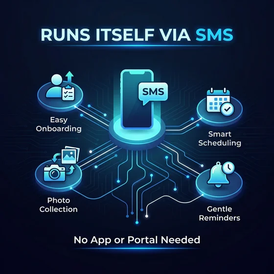 The entire experience — from first contact to finished photo book — runs through text messages. AI agents handle onboarding, photo collection, scheduling, and gentle reminders. No portal to log into. No app to download. Just text back and the system takes care of everything else.